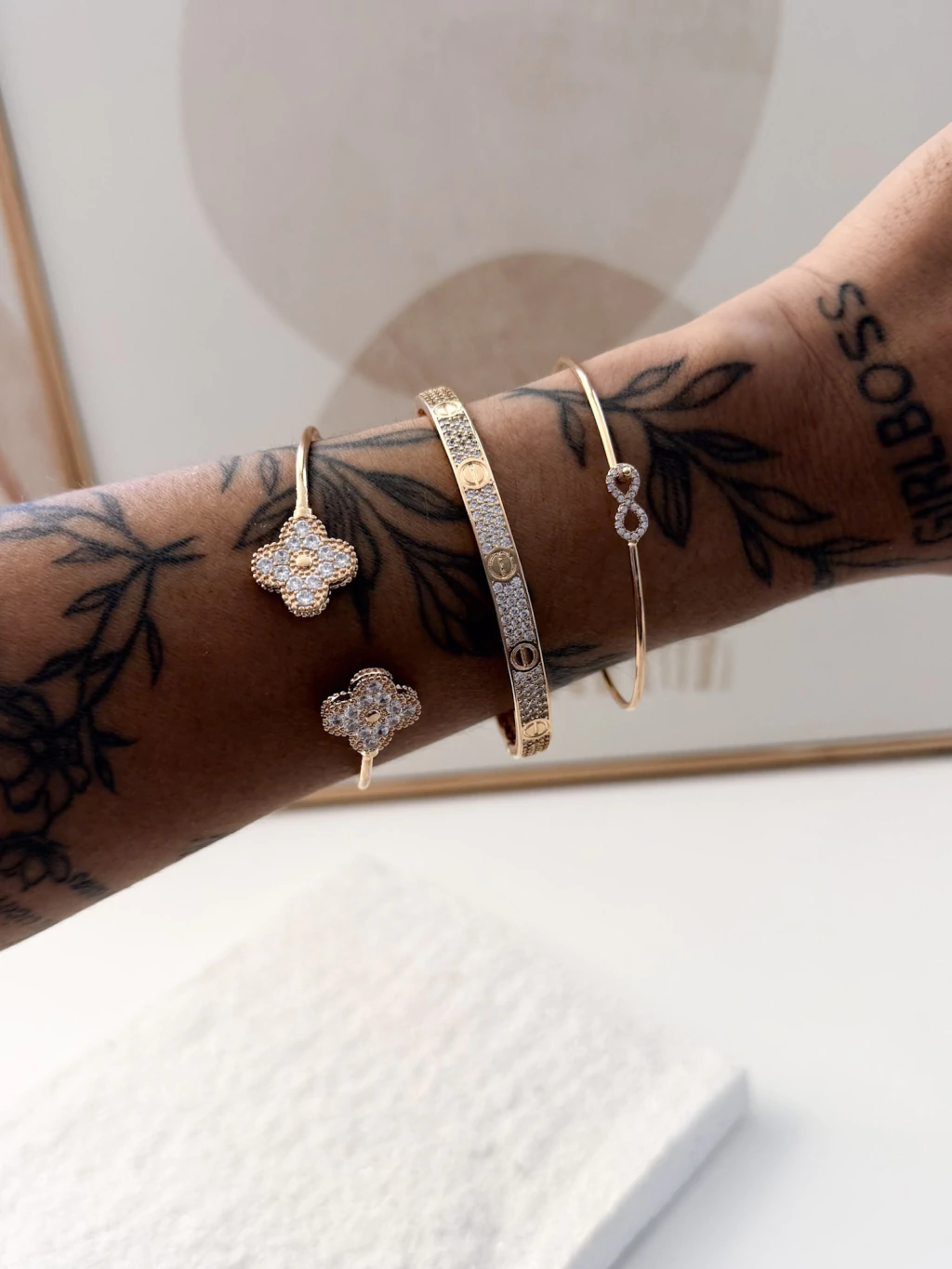 O Bracelete Inspiração Cartier é uma peça icônica, perfeita para quem ama acessórios sofisticados que nunca saem de moda. Banhado a ouro, ele possui brilho intenso, design rígido moderno e acabamento premium.
