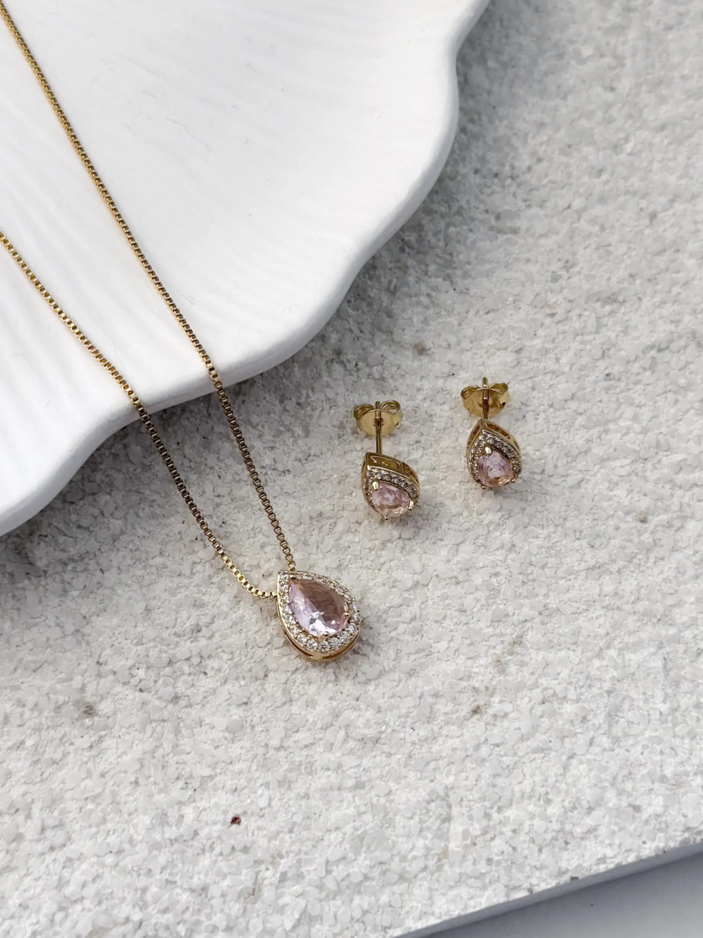 O Conjunto Gotinha Rosa Bebê é a combinação perfeita de delicadeza e charme. A pedra em tom rosa bebê traz um brilho suave e romântico, iluminando o visual com elegância e leveza. Seu design em formato de gotinha torna as peças ainda mais femininas e sofisticadas.